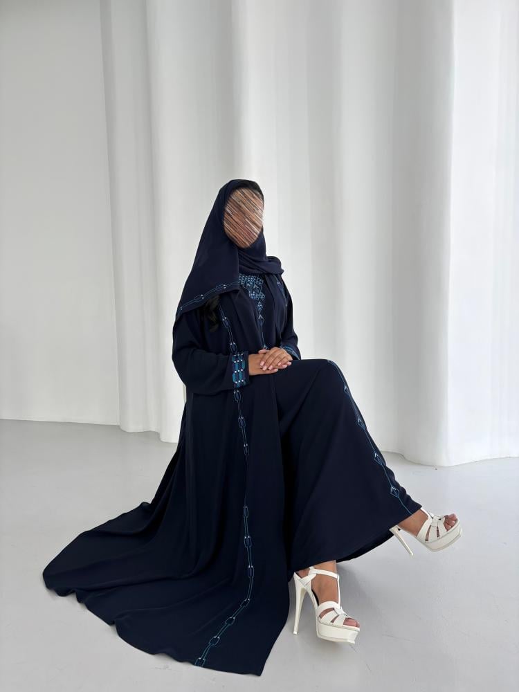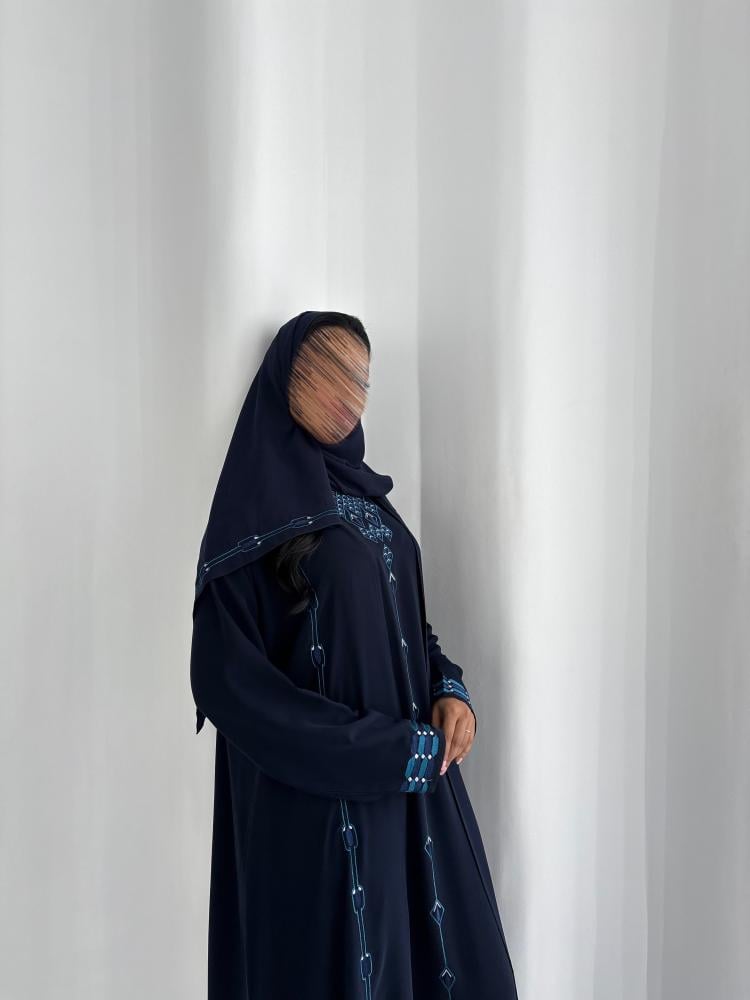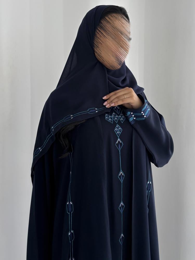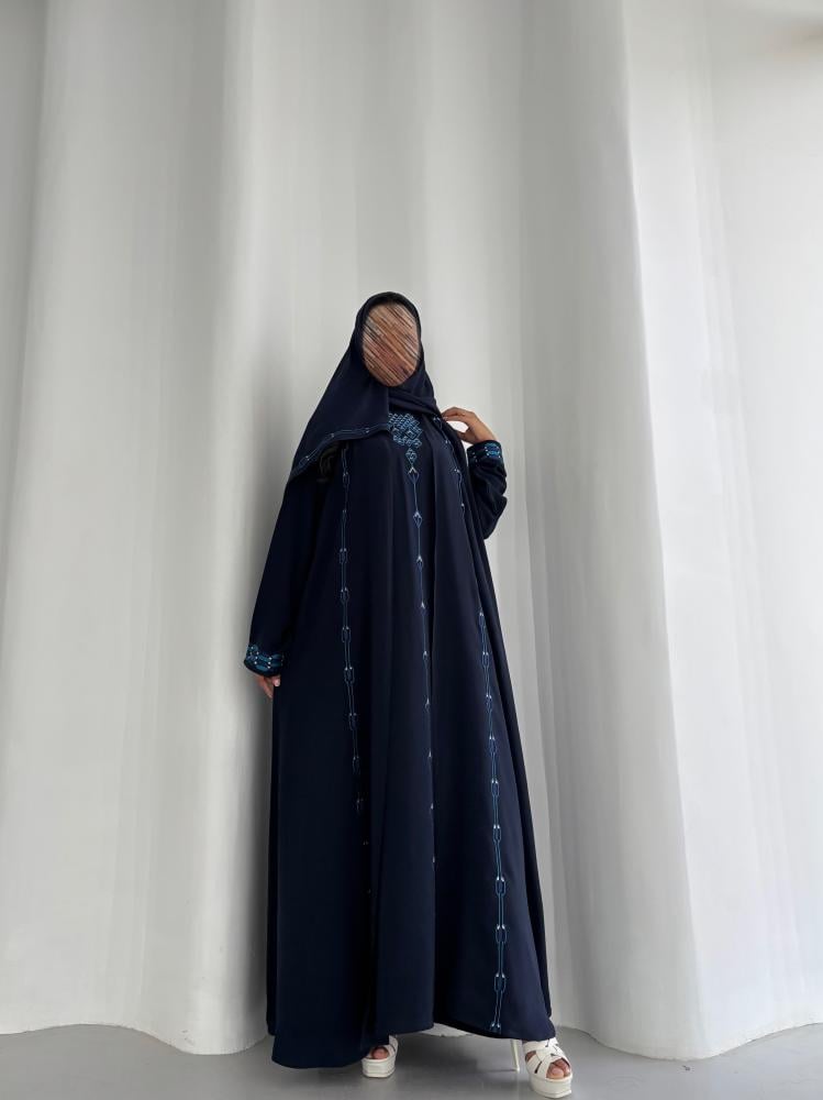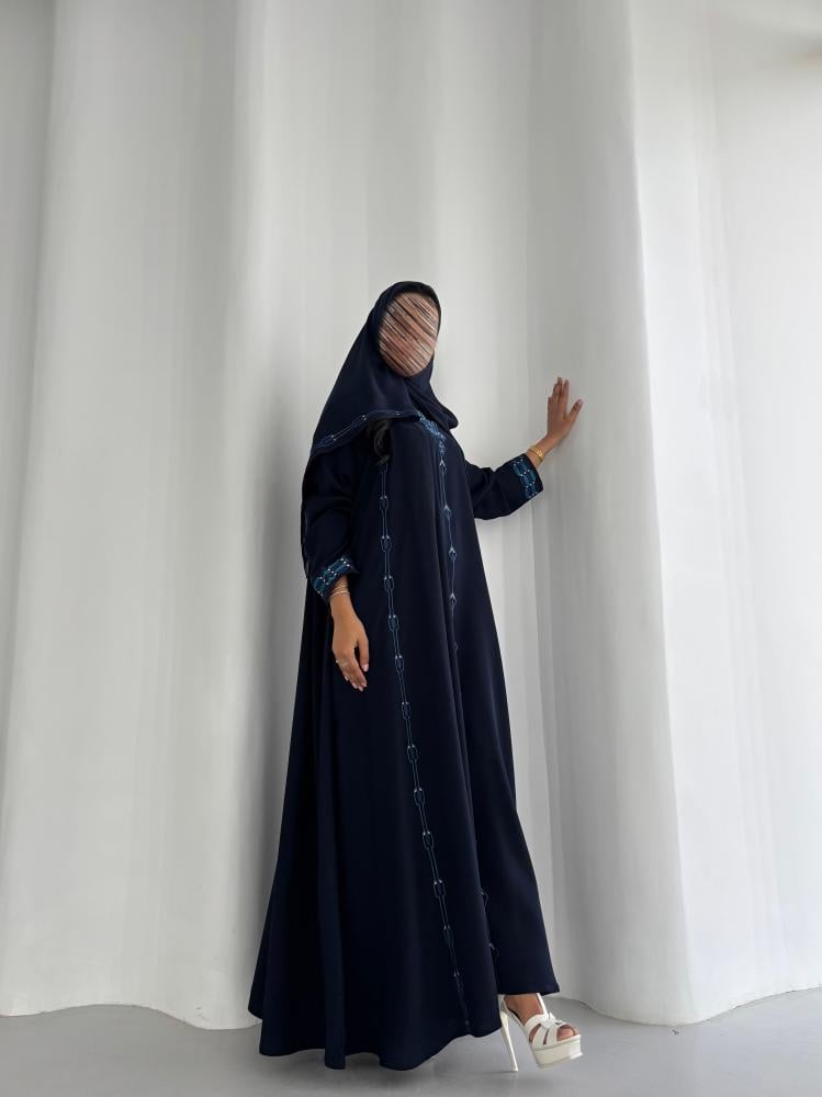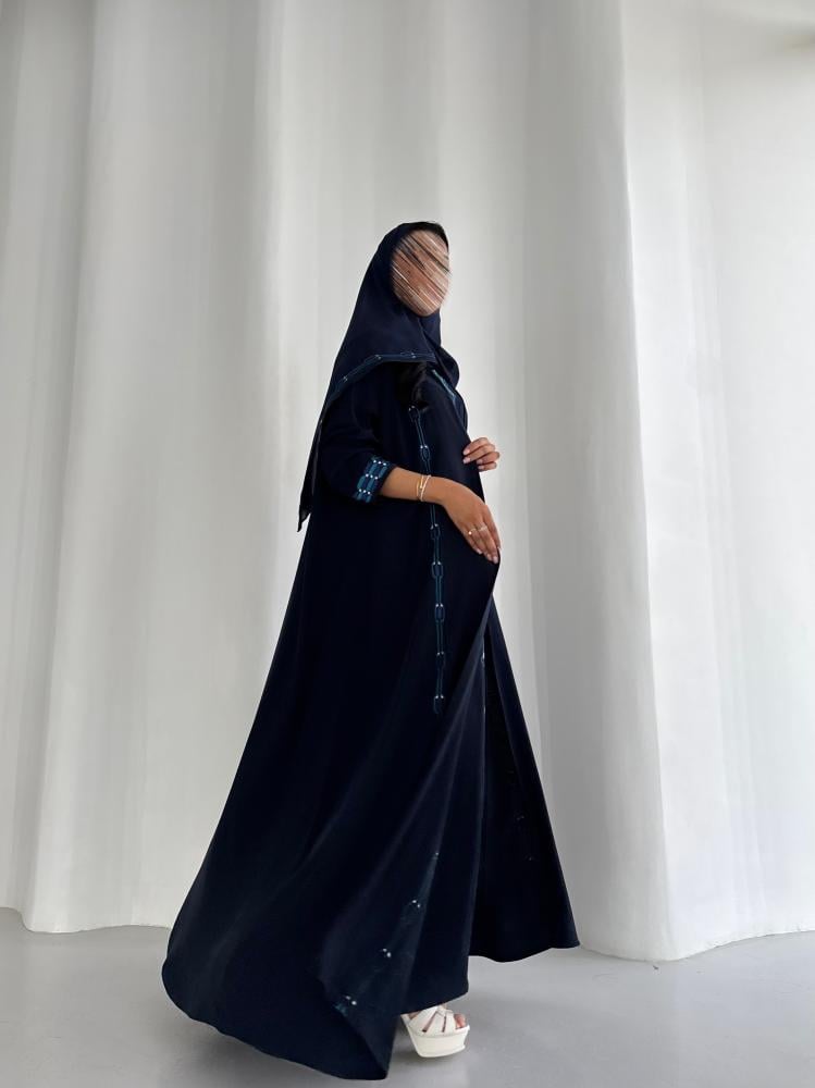 قصه العبايه : نص كلوش واسع مطرز بشكل طولي بخيوط حريريه